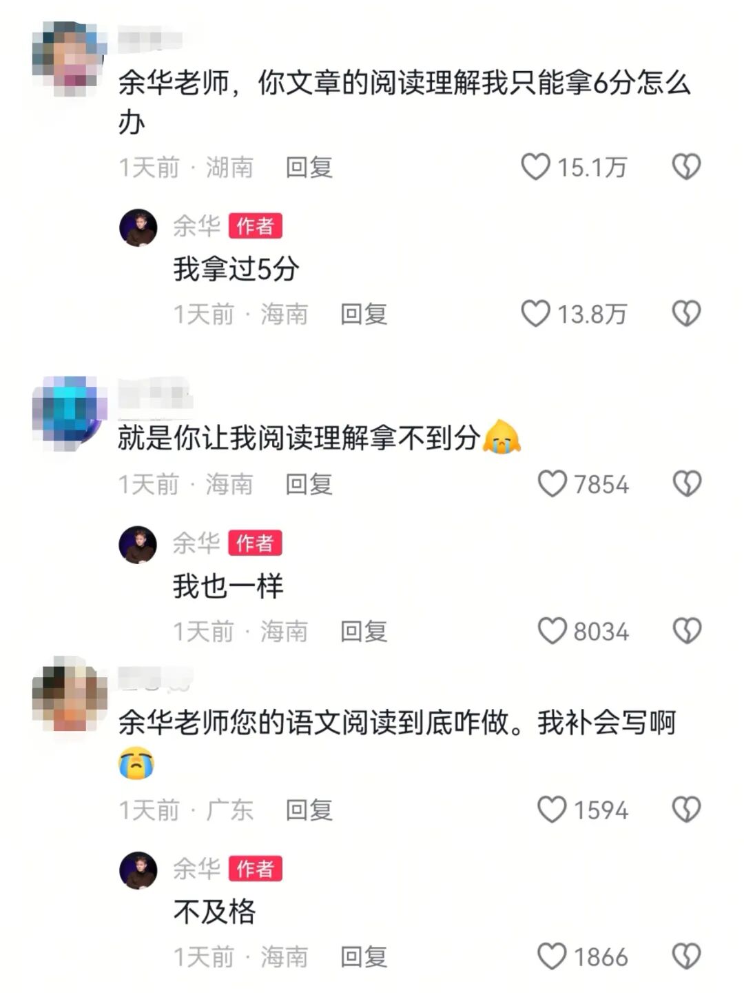 有不少网友在余华个人账号评论区留言表示,做他文章的阅读理解非常困难。余华安慰网友,自己也拿不到高分:“我拿过5分。”