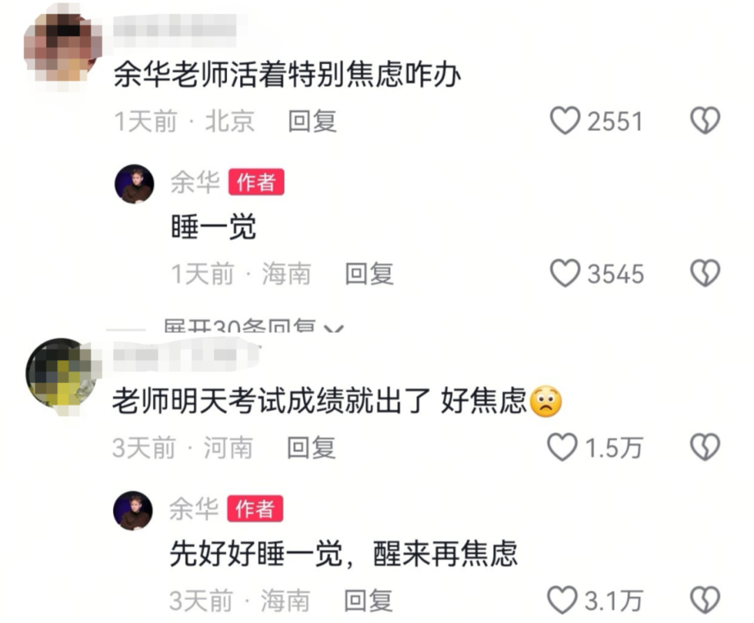 有网友向他求助如何缓解自己的焦虑,余华也认真安慰,建议他们好好睡一觉,“醒来再焦虑”。