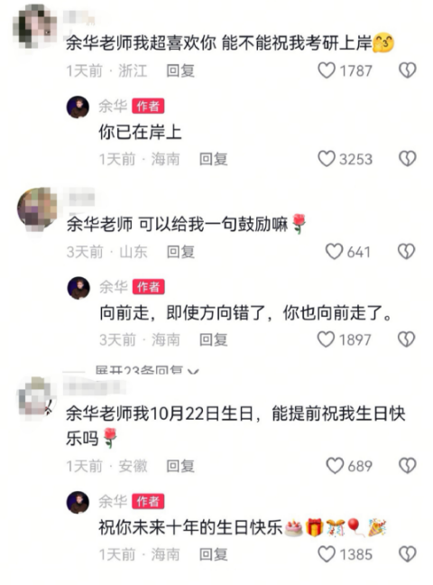 对于在评论区求祝福和鼓励的网友,余华也不吝啬自己的回复,多次送上对网友学业、生日等的祝福,回复到“手指发麻了”。