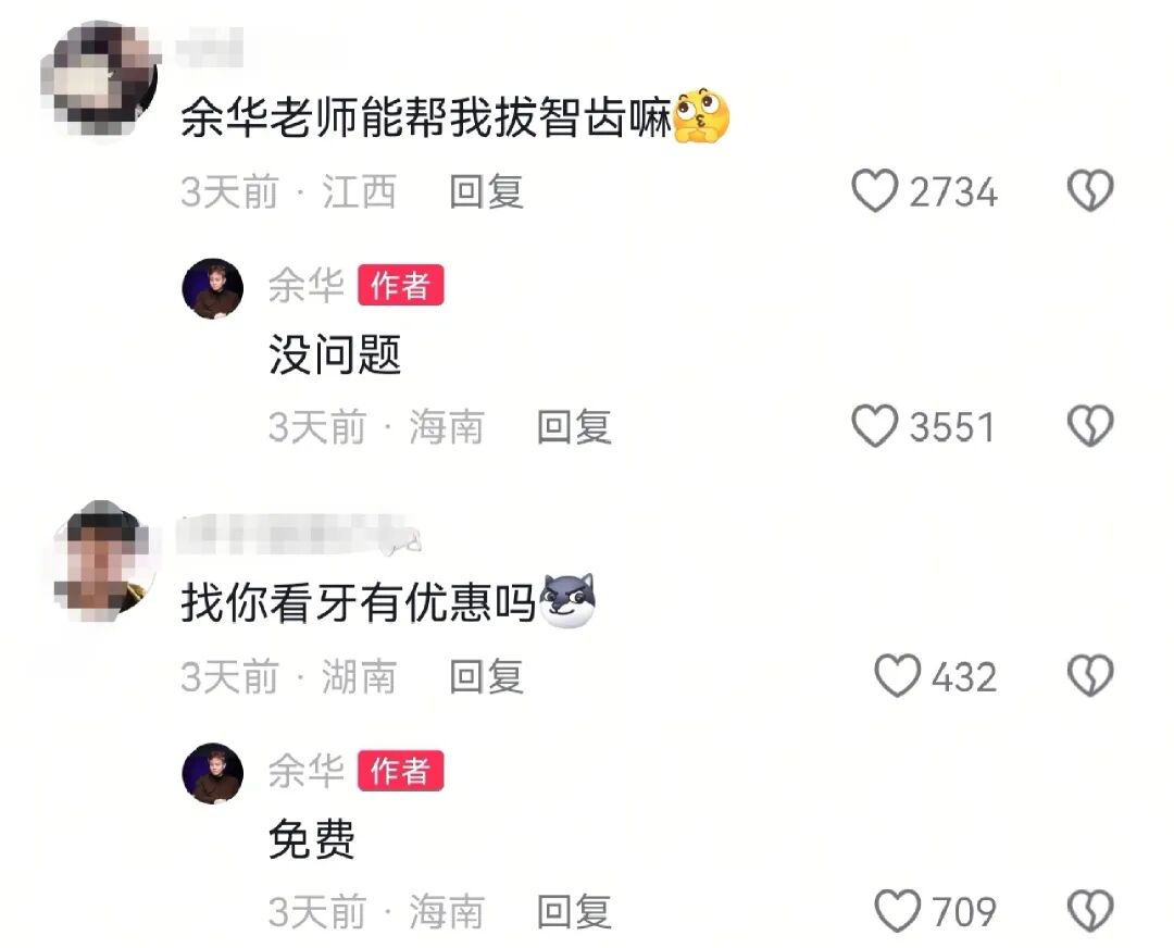 也有网友开玩笑称要找曾当过牙医的余华看牙、拔智齿。他也大方回复,“没问题”“免费”。