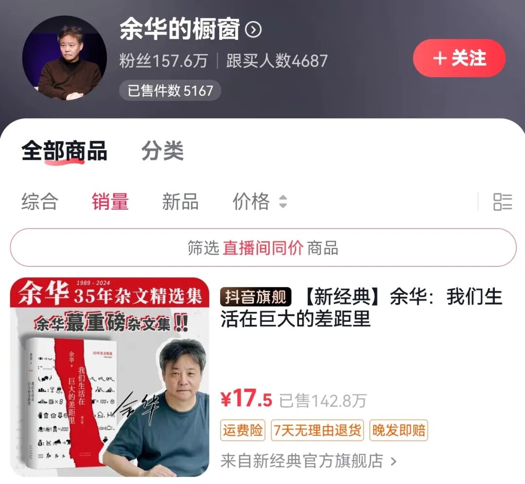 余华在互联网上人气颇高,书籍的销量也不低。在他抖音账号关联的橱窗中可以看到,他销量最高的书籍是杂文精选集《我们生活在巨大的差距里》,目前已售出142.8万本。