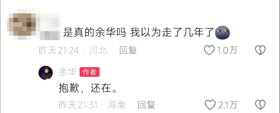 还有网友见他十分活跃,在评论区提出疑问,“是真的余华吗?我以为走了几年了。”余华也并未生气,幽默回复道:“抱歉,还在。”