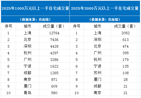 近日,国内各大主流城市2025年总价1000万元以上新房、二手高端住宅成交套数排名数据出炉。