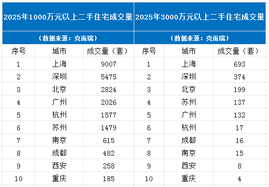 二手房方面,问鼎榜首的城市同样是上海。克而瑞数据显示,上海在2025年累计成交了9007套总价1000万元以上二手住宅,遥遥领先。