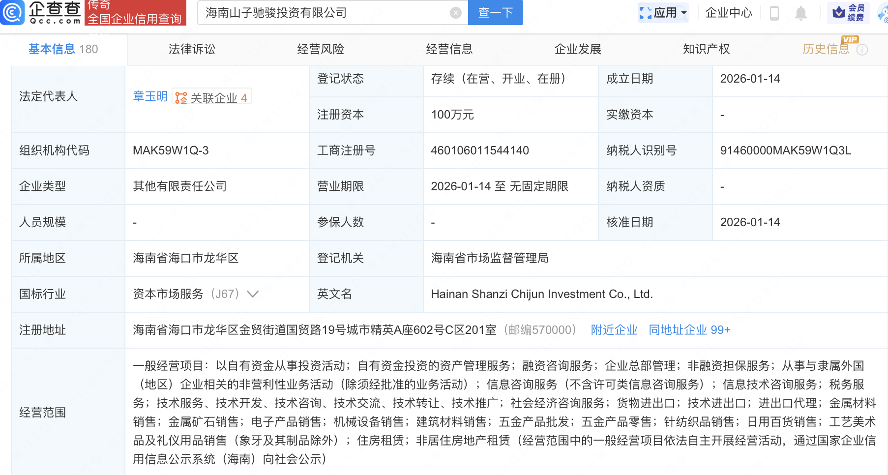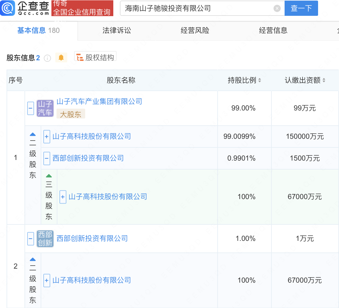 近日,海南山子驰骏投资有限公司成立,经营范围包含:金属材料销售;金属矿石销售;电子产品销售;机械设备销售;建筑材料销售等。企查查股权穿透显示,该公司由山子高科(000981)间接全资持股。